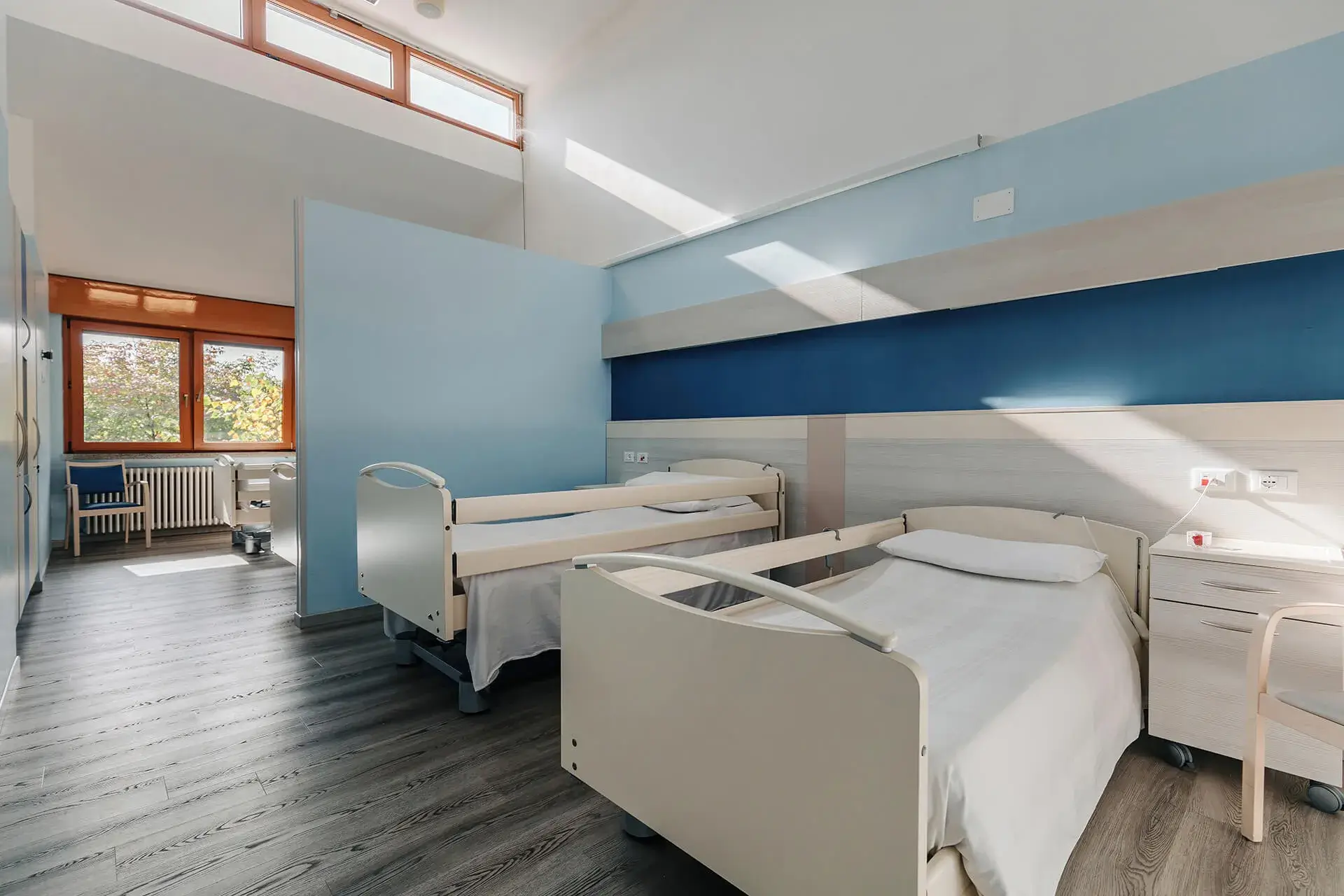 Al PRIMO PIANO vi sono 6 stanze doppie e 12 stanza due posti più due, dotate di servizi igienici, due bagni attrezzati; un’ampia sala comune per gli ospiti non autosufficienti e un locale cucina adiacente, gli ambulatori medico e infermieristico, un salotto dedicato ad attività educative, un soggiorno con televisione, spazi attrezzati in prossimità delle camere (bow windows) e un giardino attrezzato per i pazienti affetti da demenza.