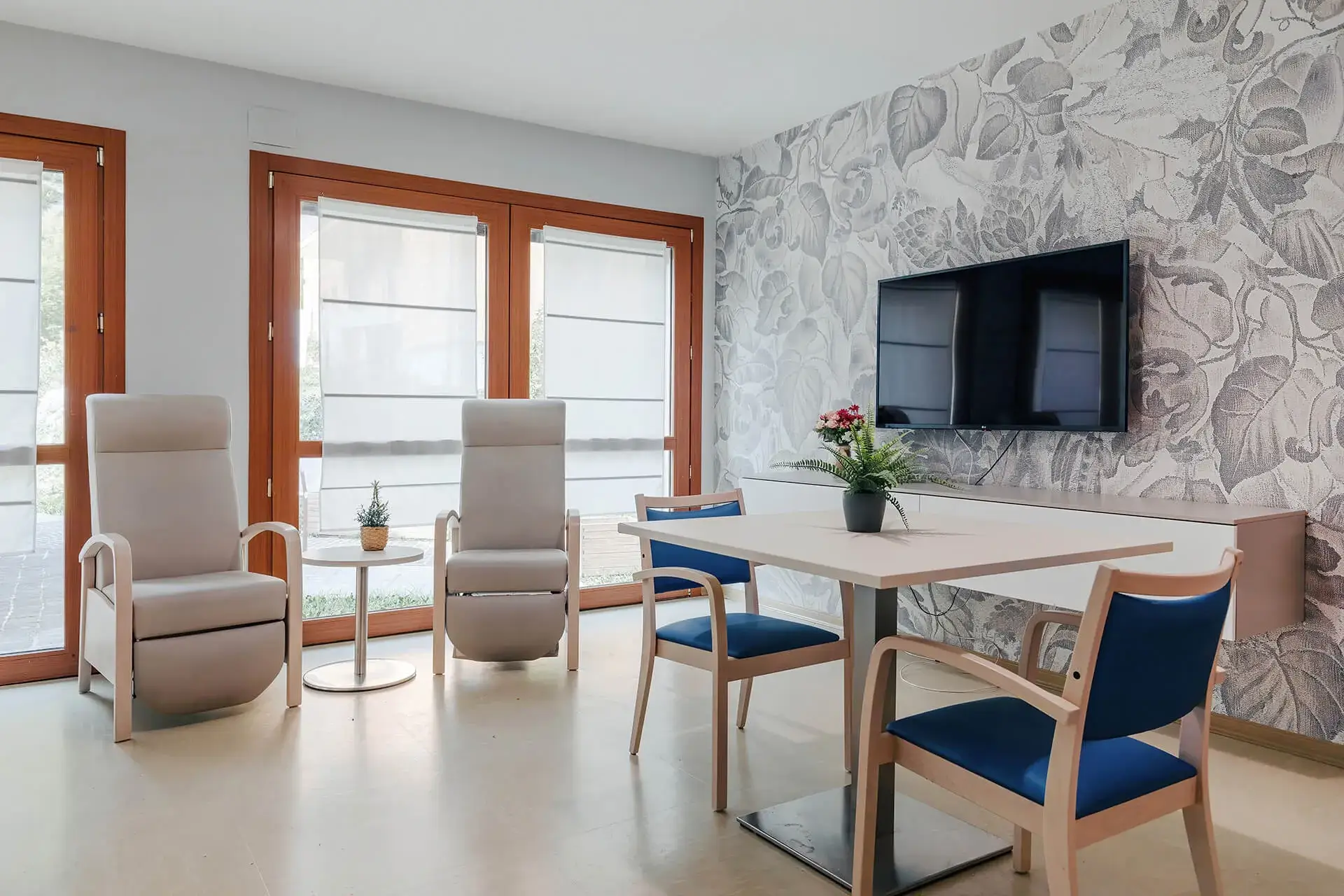 Al PIANO TERRA trovano sede le sale comuni e i principali punti di riferimento comuni tra cui l’ingresso, la portineria, il salone centrale con area televisione, il salottino biblioteca/caminetto, la Chiesa, un ambulatorio di fisioterapia e la palestra, un’area dedicata alle attività educative e di socializzazione, un ufficio riservato al servizio psicologico.